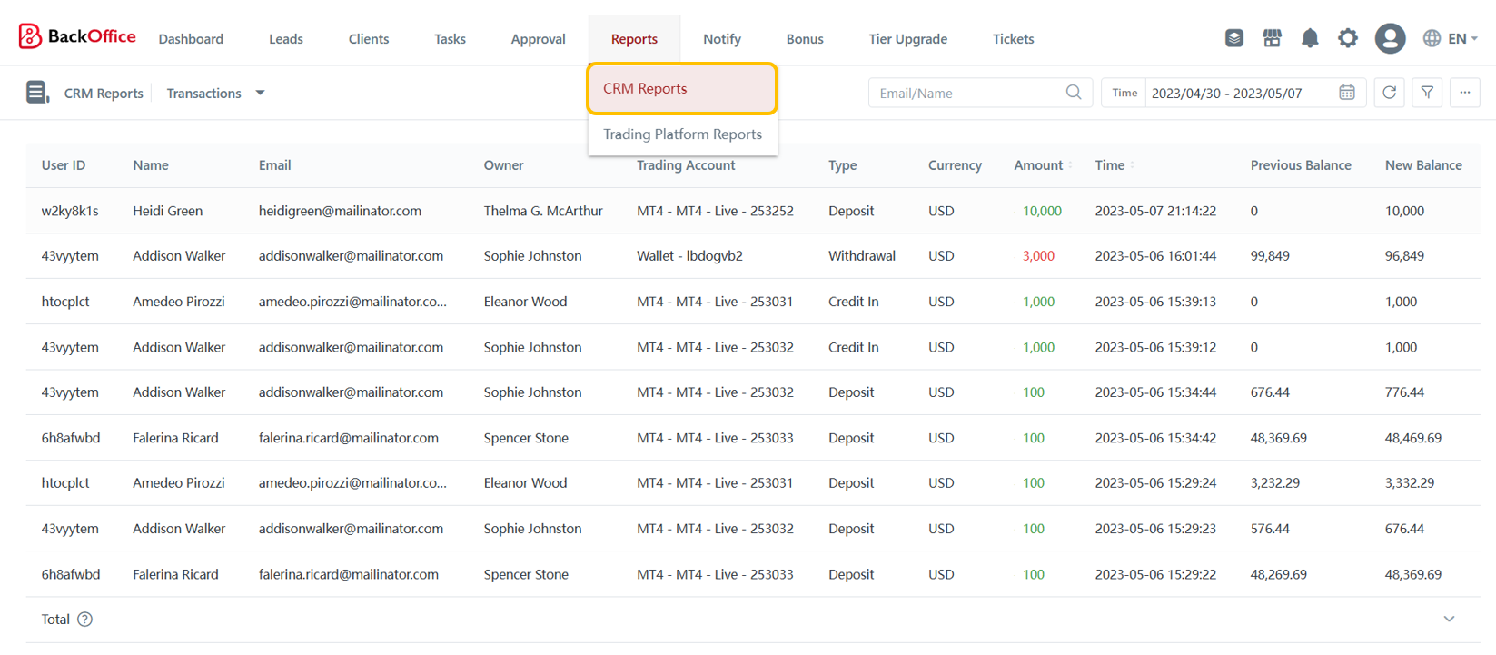 The "Reports" tab offers broker the ability to access multiple reports within the CRM. These reports are classified into two main categories:
