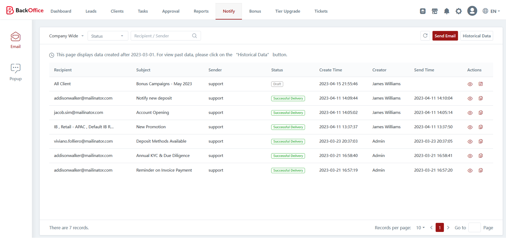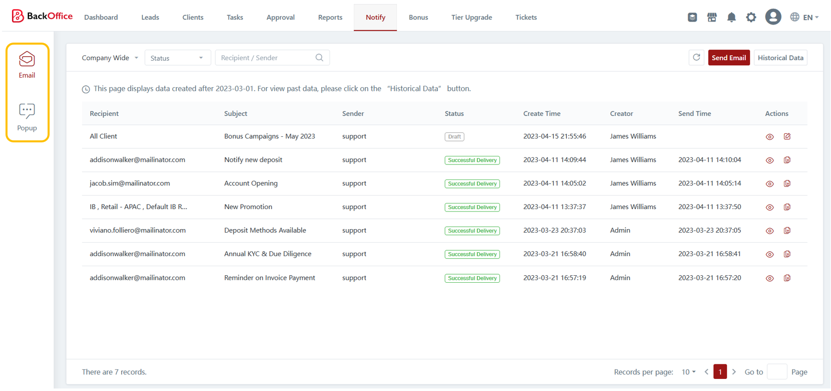 The Notify module empowers brokers to communicate with clients through the CRM by sending out notifications. Brokers have the flexibility to choose between email notifications or pop-up notifications to reach their clients effectively. This feature enhances communication channels, enabling brokers to provide timely updates, important announcements, or relevant information to their clients, ensuring a seamless and efficient communication process.