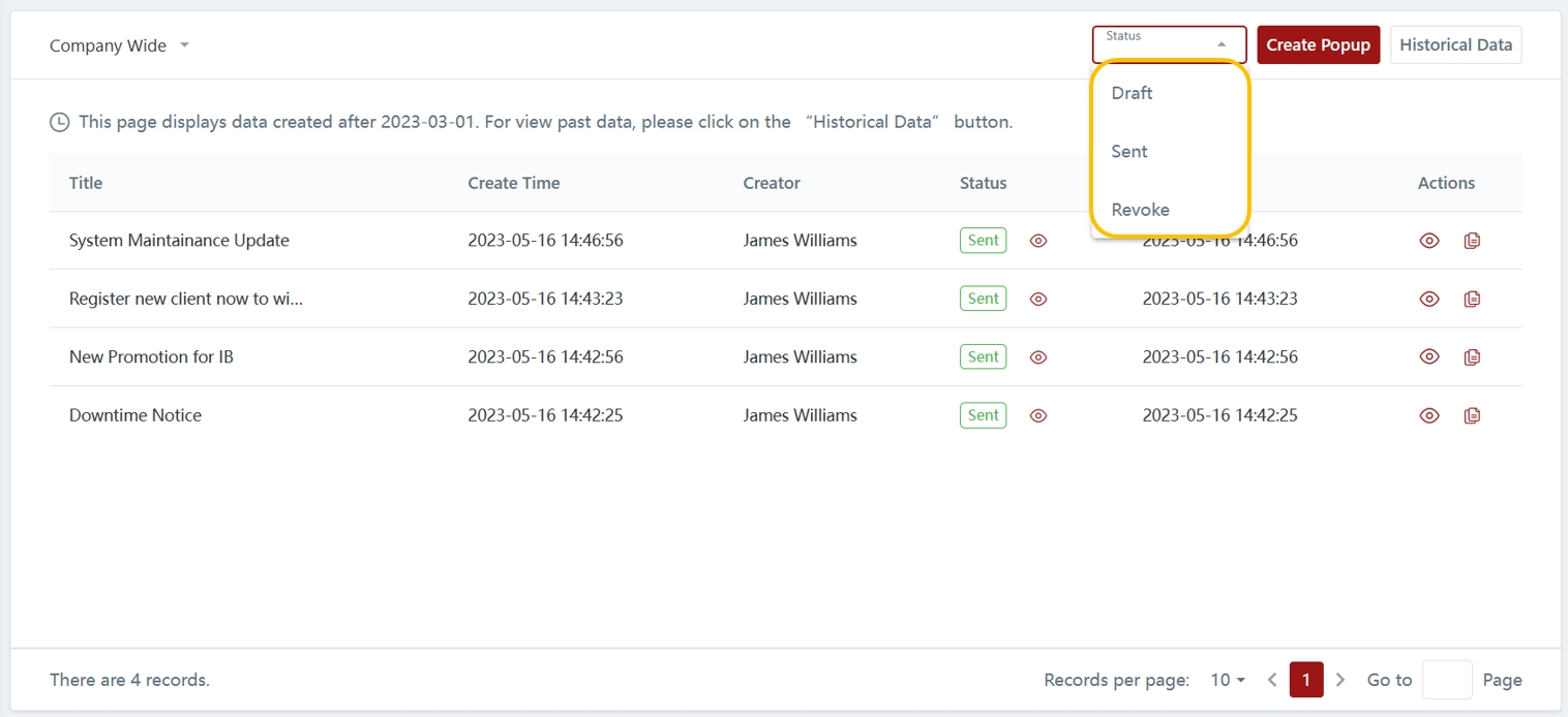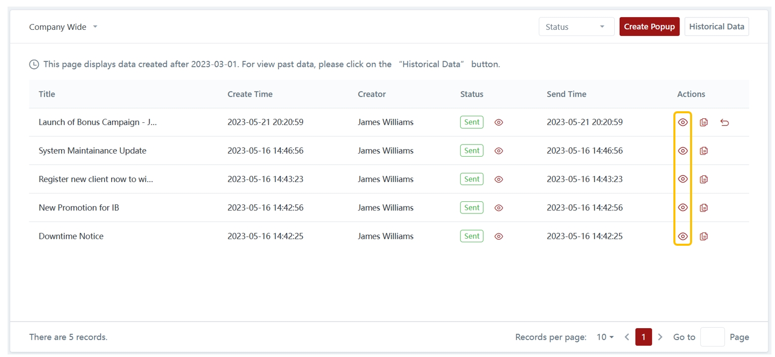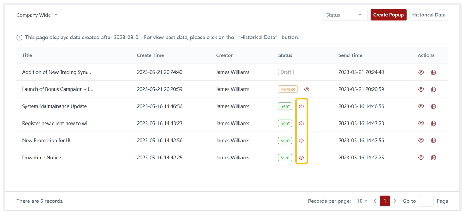 Brokers will have access to a comprehensive view of all pop-up notification records sent to clients.