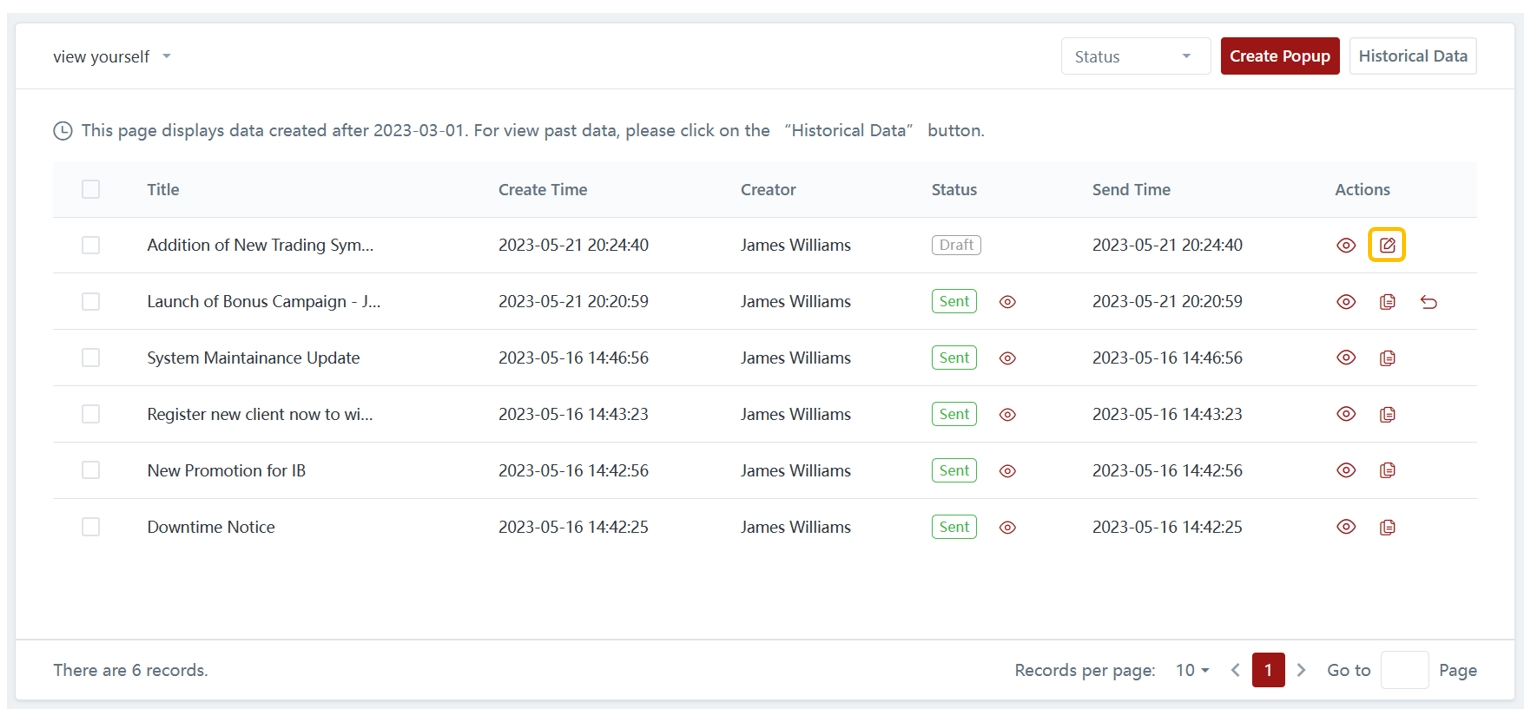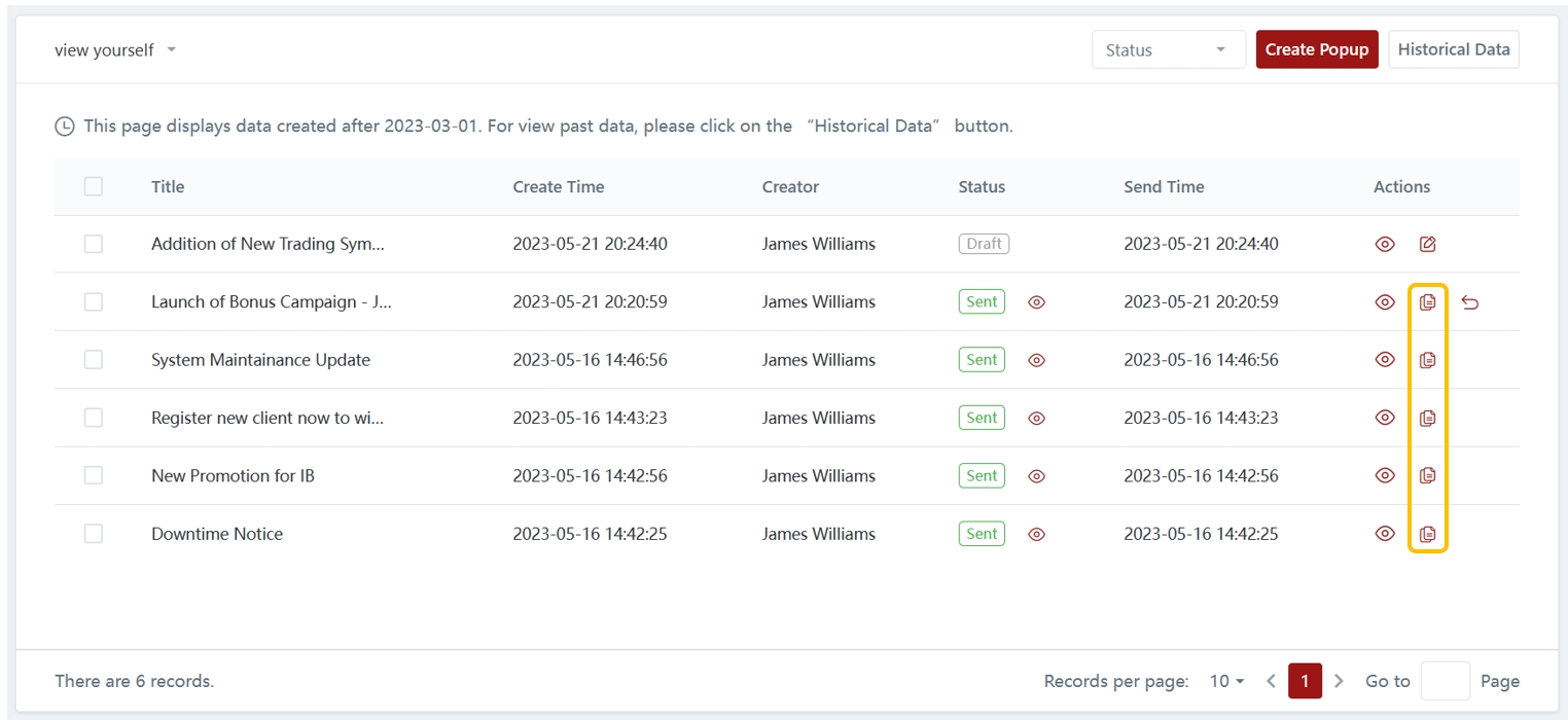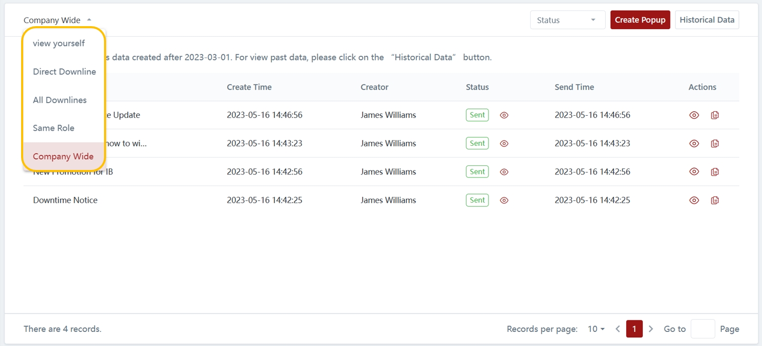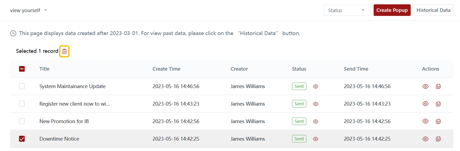 Brokers will have access to a comprehensive view of all pop-up notification records sent to clients.