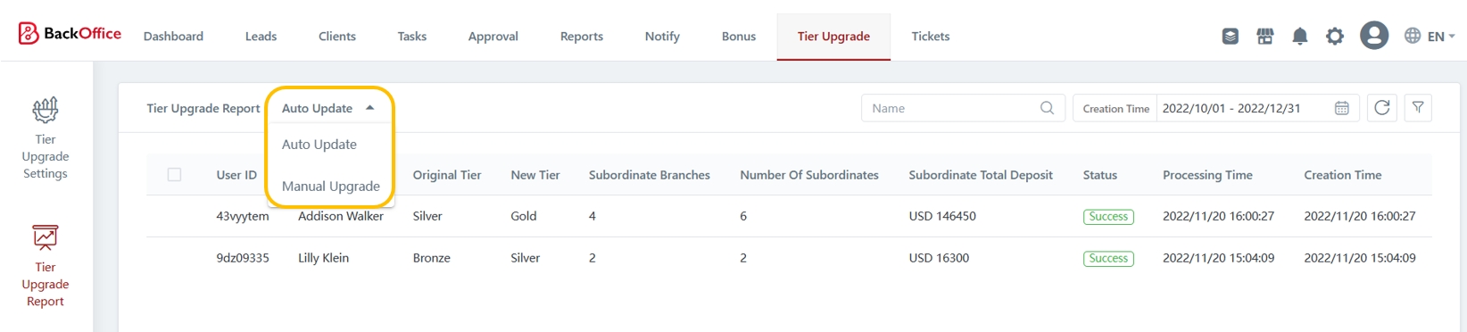 Auto Upgrade Report: This report displays all clients/IBs who have met the auto upgrade requirements. It provides a comprehensive view of the status of tier upgrades that have been completed.