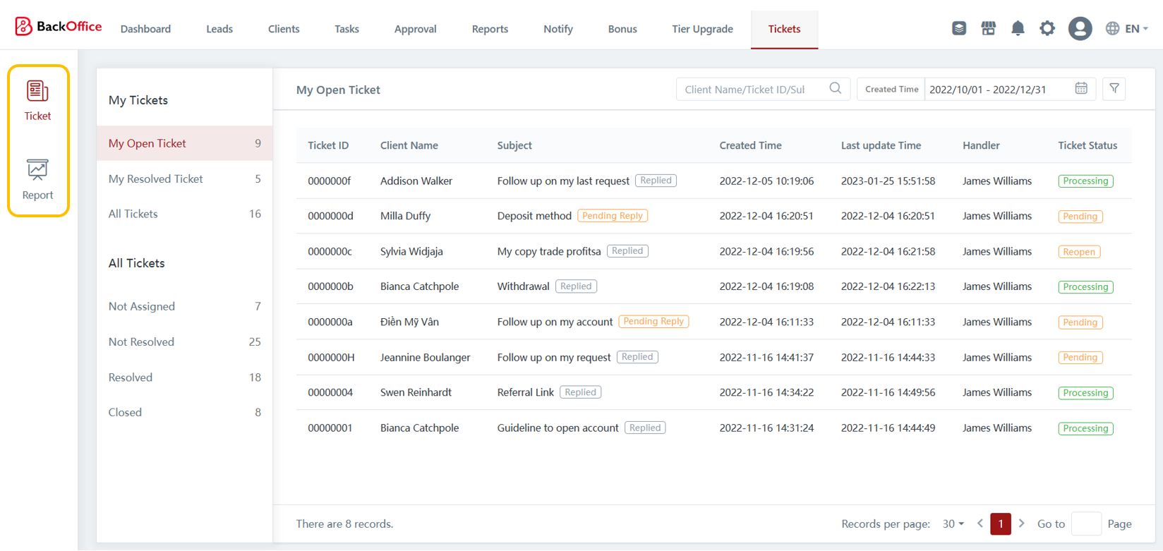 Tickets: This section enables you to access and manage all tickets. Here, you can view and handle tickets submitted by clients, ensuring effective ticket management.