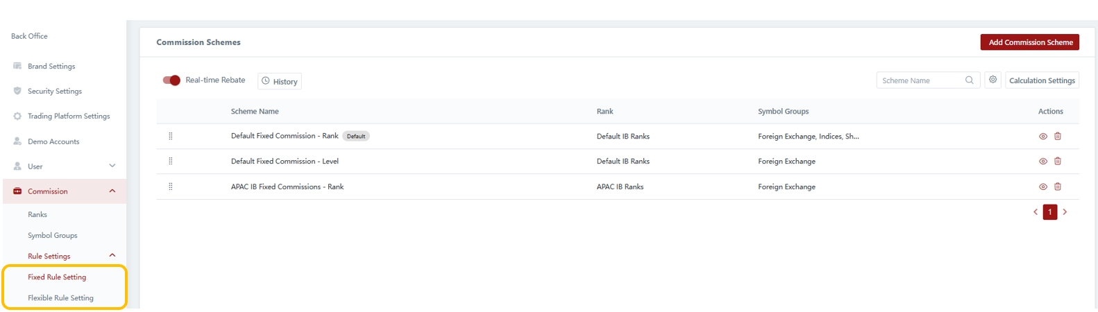 In the Rule Settings, you have the ability to configure commission schemes for your IBs. You can easily switch between the two commission scheme options, Fixed or Flexible, using the side menu.