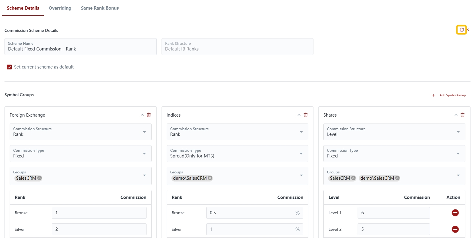 You will be able to configure the commission type, applicable trading groups, commission amount and many more.