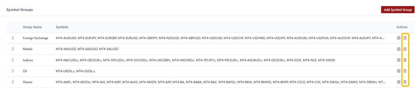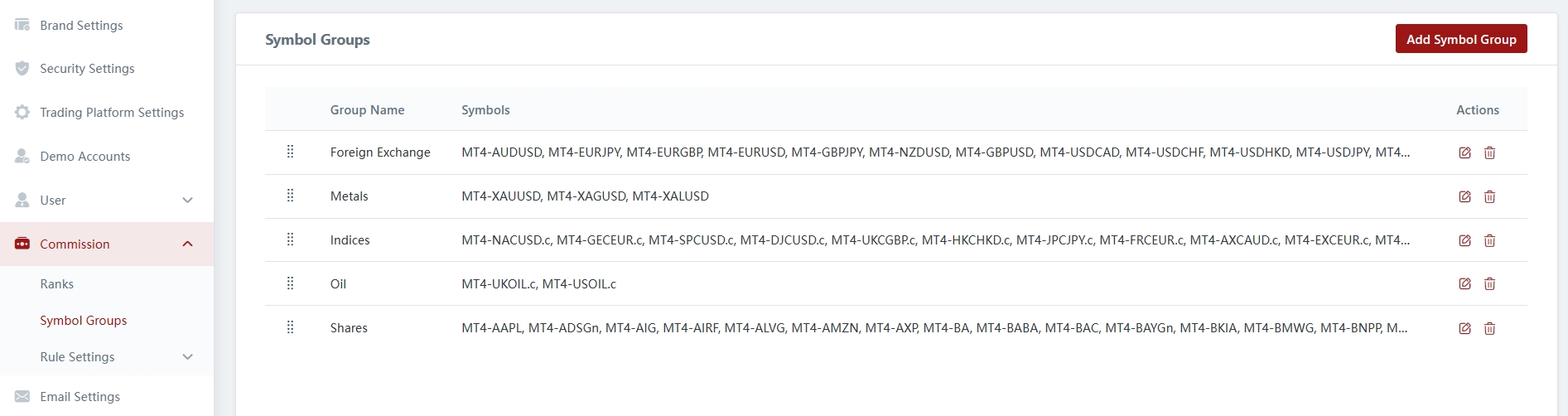 In the Symbol Group Settings, you have the ability to group symbols into distinct categories. This grouping enables you to establish varying commission payout amounts for each symbol group. By organizing symbols into specific groups, you can efficiently manage commission structures tailored to different symbol categories.