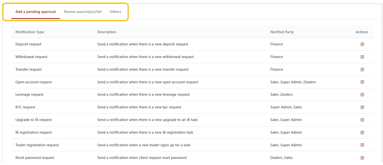 Notifications in the CRM are divided into three categories: