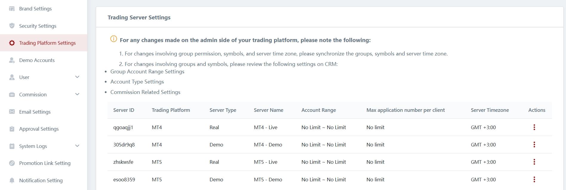 In the Trading Platform Settings, you can access and manage all the trading platforms that have been integrated to your CRM. This includes viewing the settings of each trading platform and making necessary edits. Additionally, you have the option to restart the gateway and synchronize important data such as time zones, groups, and symbols with the trading platforms.