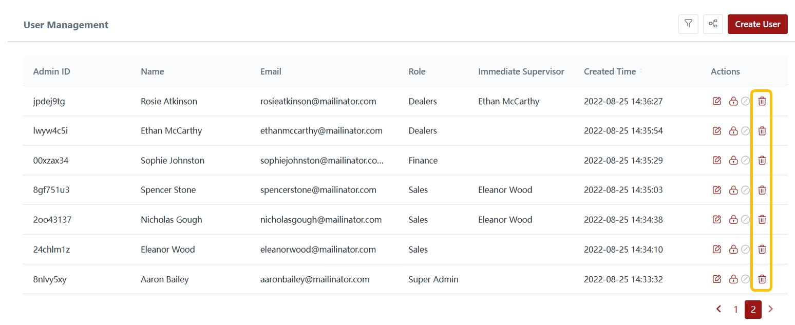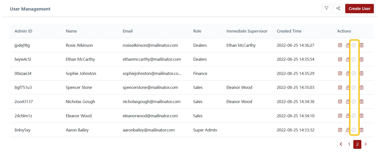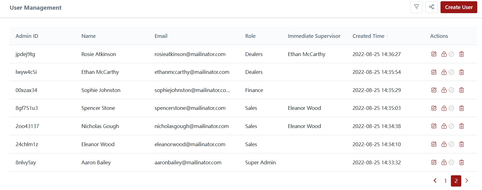 In the User Management tab, you have access to a comprehensive overview of all back office user accounts, along with their corresponding details.