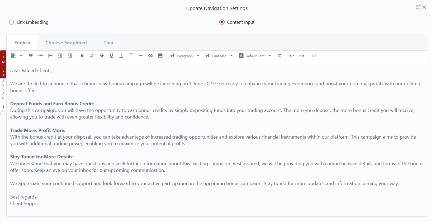 Once you have created the navigation tabs in the CRM Client Portal, you will need to input the content. There are two ways to do this: