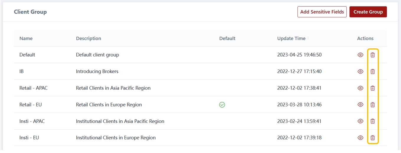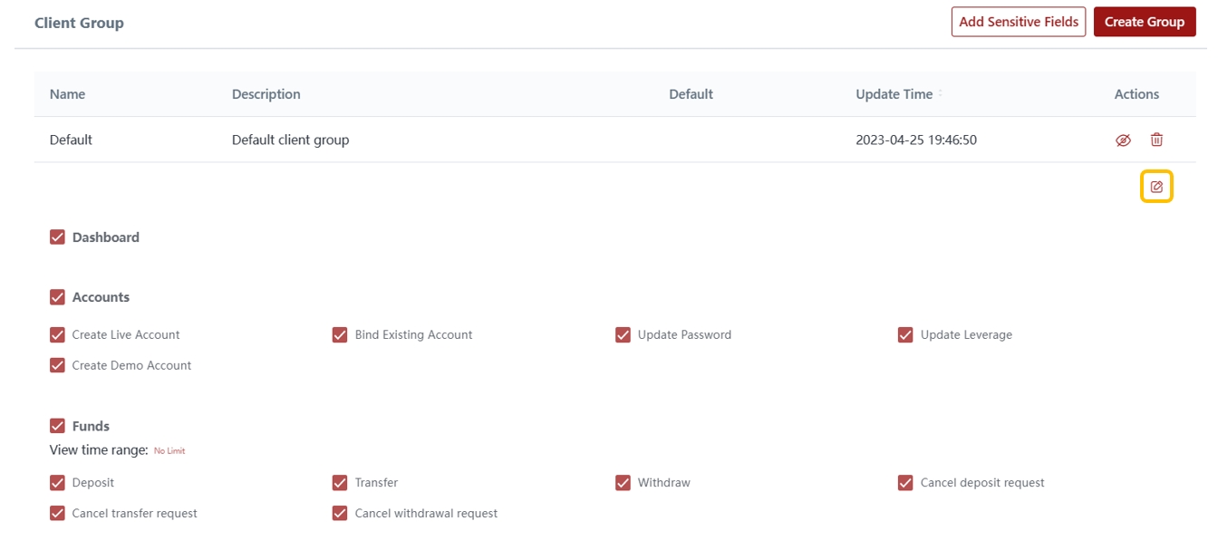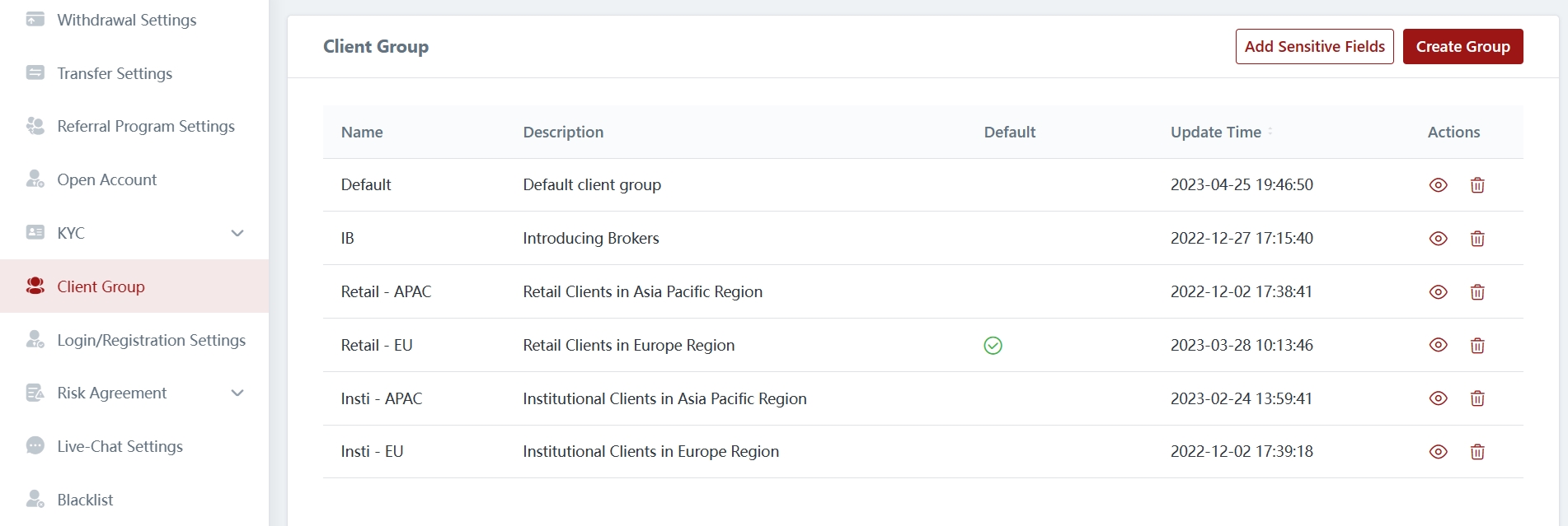 In the Client Group Settings, you can create and configure different client groups, each with specific permissions and functionalities on the CRM Client Portal. This allows you to customize the experience for different client groups. For instance, you can hide referral functionalities for clients who are solely traders. Additionally, you have the option to customize the display of sensitive data for clients by hiding certain private or sensitive information on the CRM client portal.