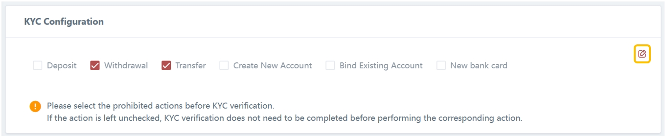 In the KYC configuration settings page, you can define the prohibited actions for clients who have not completed their KYC. This means that clients without completed KYC will be restricted from performing certain actions.