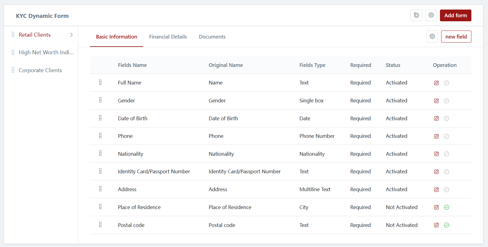 In the KYC dynamic form settings page, you have the ability to create KYC forms for different client types and customize the required fields and documents that clients need to submit. This allows you to tailor the KYC process based on the specific requirements for each client type.