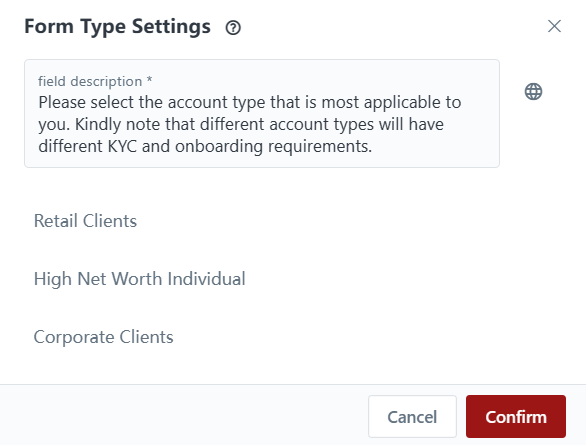 You have the option to add a description to guide clients in selecting the appropriate KYC form. This description can provide clients with instructions or information to help them determine which KYC form is applicable to their specific client type. It serves as a helpful reference to ensure clients choose the correct form for their KYC submission.