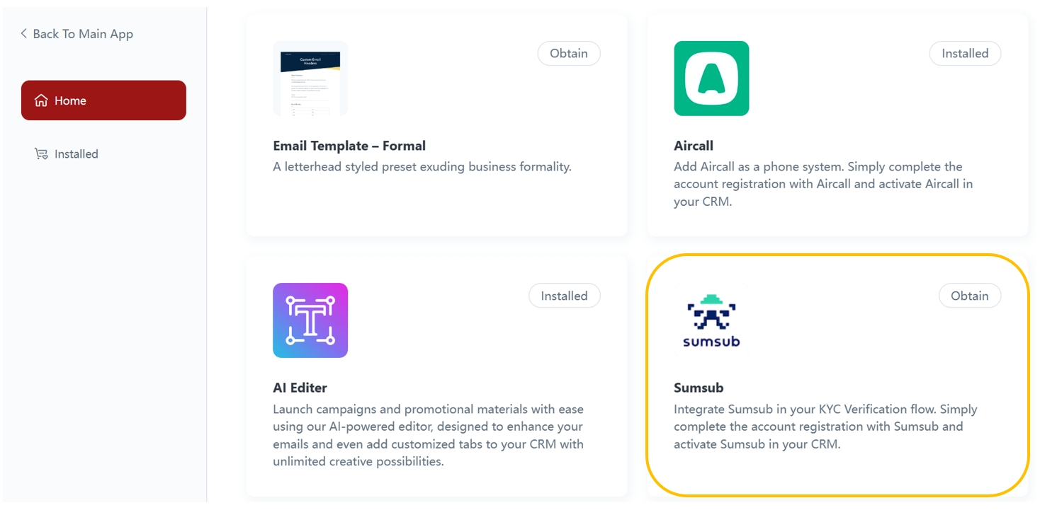 To begin using SumSub, you will need to install it via the CRM Marketplace.
