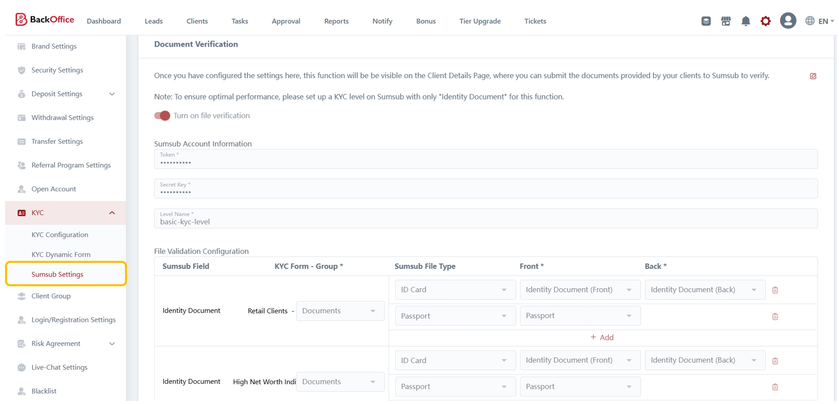 Once the respective permissions have been granted, you will be able to view "SumSub Settings".