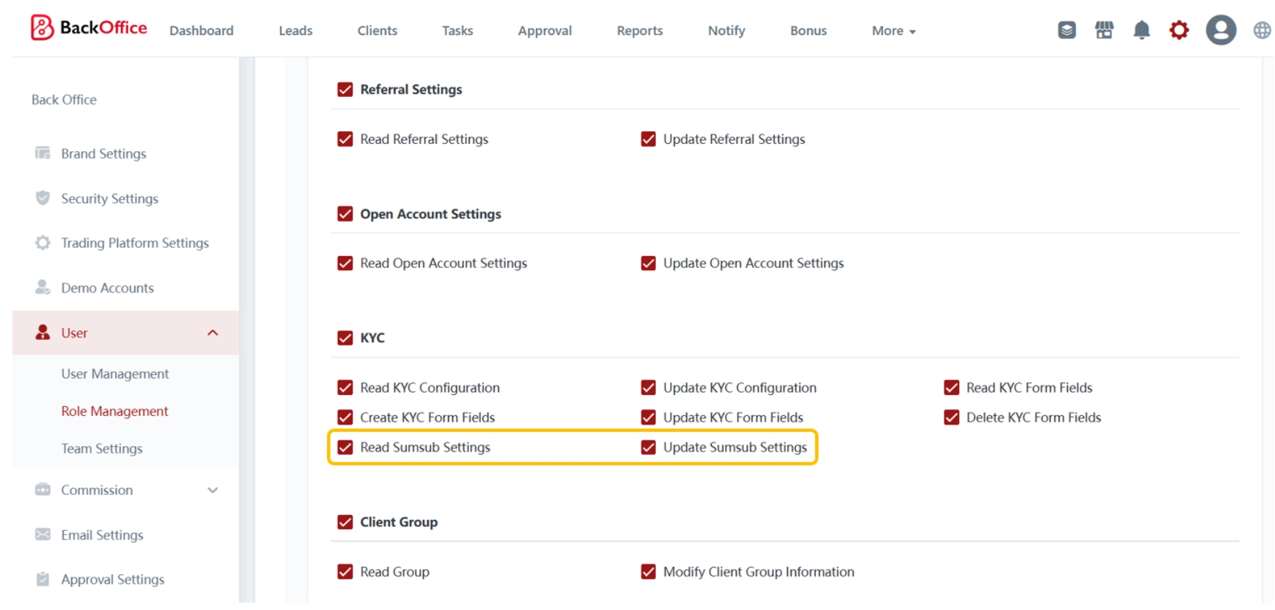 Upon installation of SumSub, you will need to ensure the respective permissions are enabled.