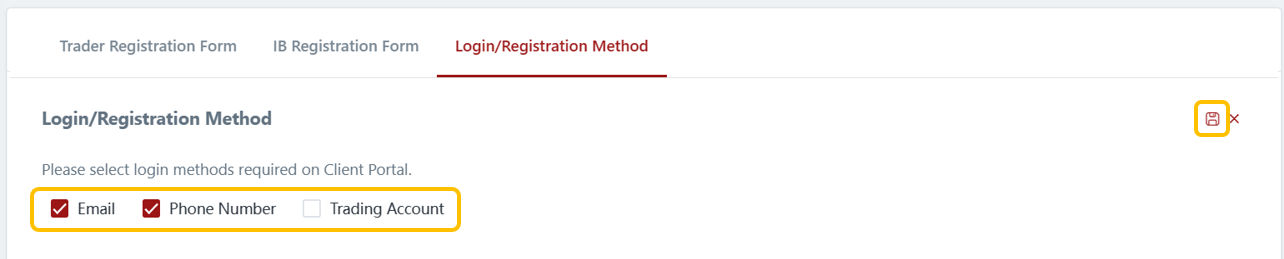 In the Login/Registration Method settings, you have the flexibility to customize the available login methods for your clients. The options include login via email address, phone number, or trading account. This customization allows you to cater to the preferences and convenience of your clients, providing them with a seamless and personalized login experience.