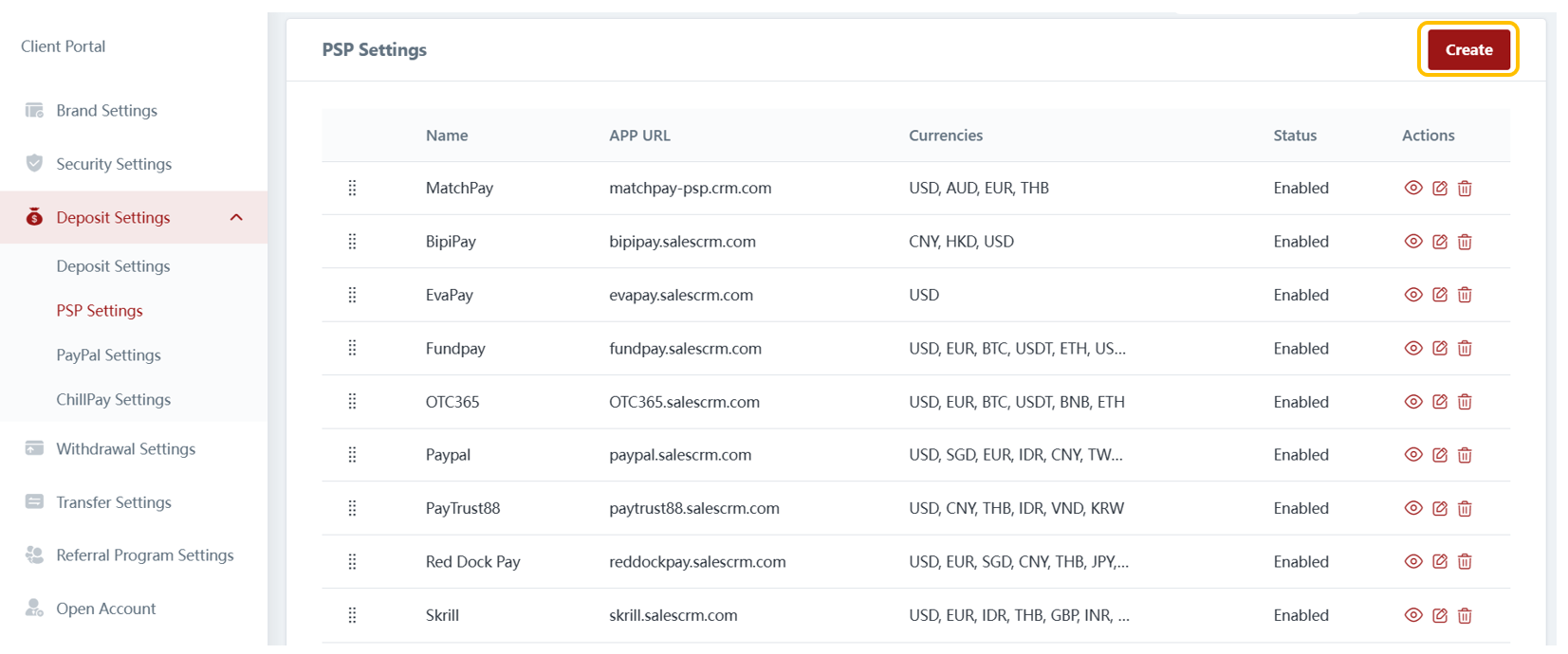 In the PSP (Payment Service Provider) settings, you have the option to set up PSPs as payment options within your CRM system. However, it's important to note that integration with the CRM is required for each PSP before it can be added as a payment option.