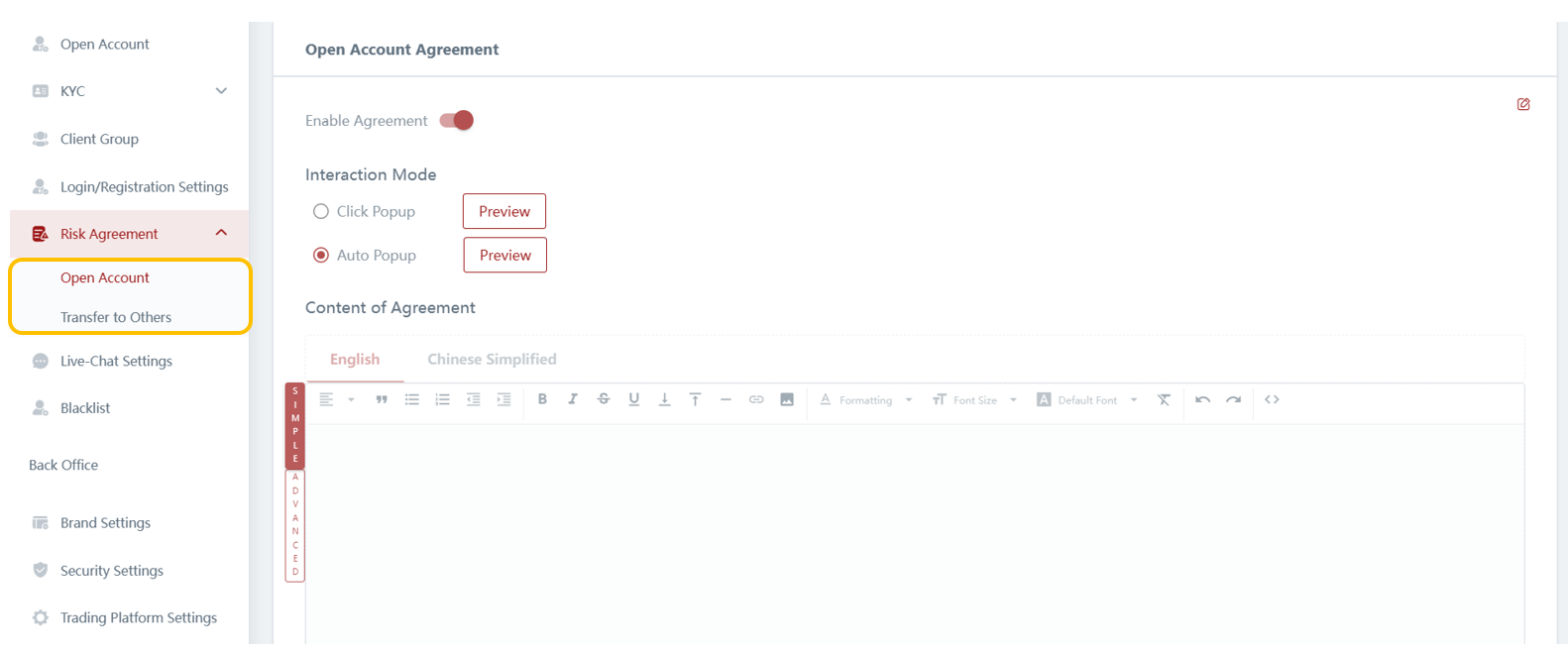 In the Risk Agreement settings, you can configure the agreement for trading account requests and transfer requests. This allows you to include terms and conditions that clients can review before proceeding with their request submission. Clients will be required to agree to the terms and conditions before they can proceed, ensuring compliance and mutual understanding between your business and the clients.