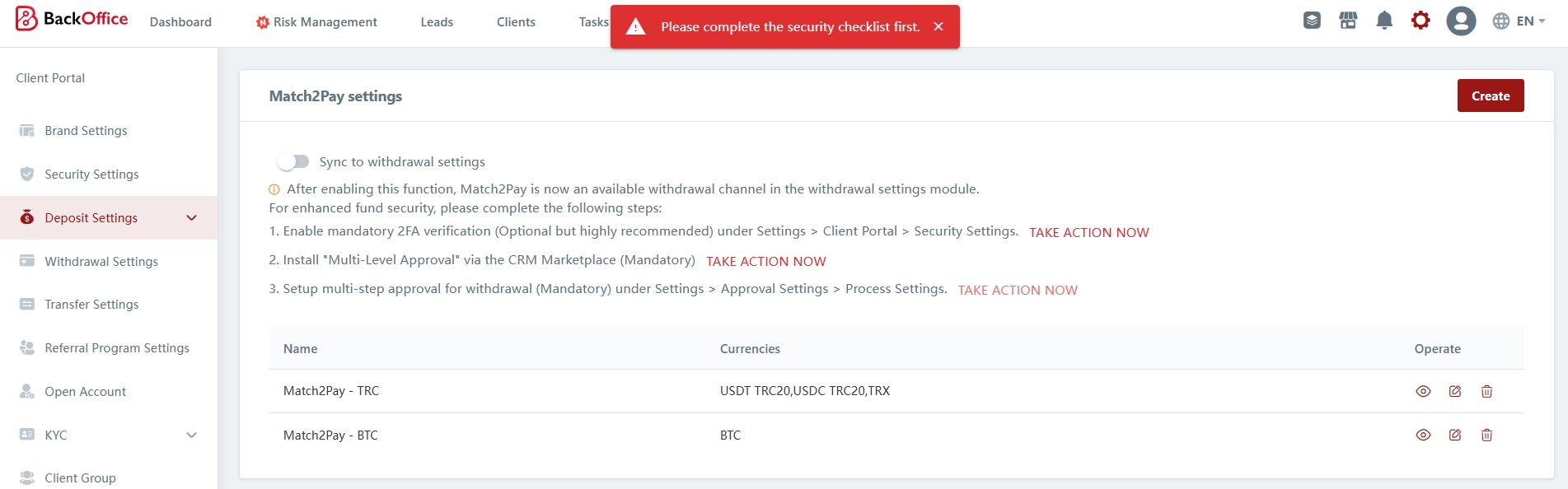 Without completing the security checklist, you will not be able to enable Match2Pay as a withdrawal method. A popup notice will appear to inform you to complete the security checklist.