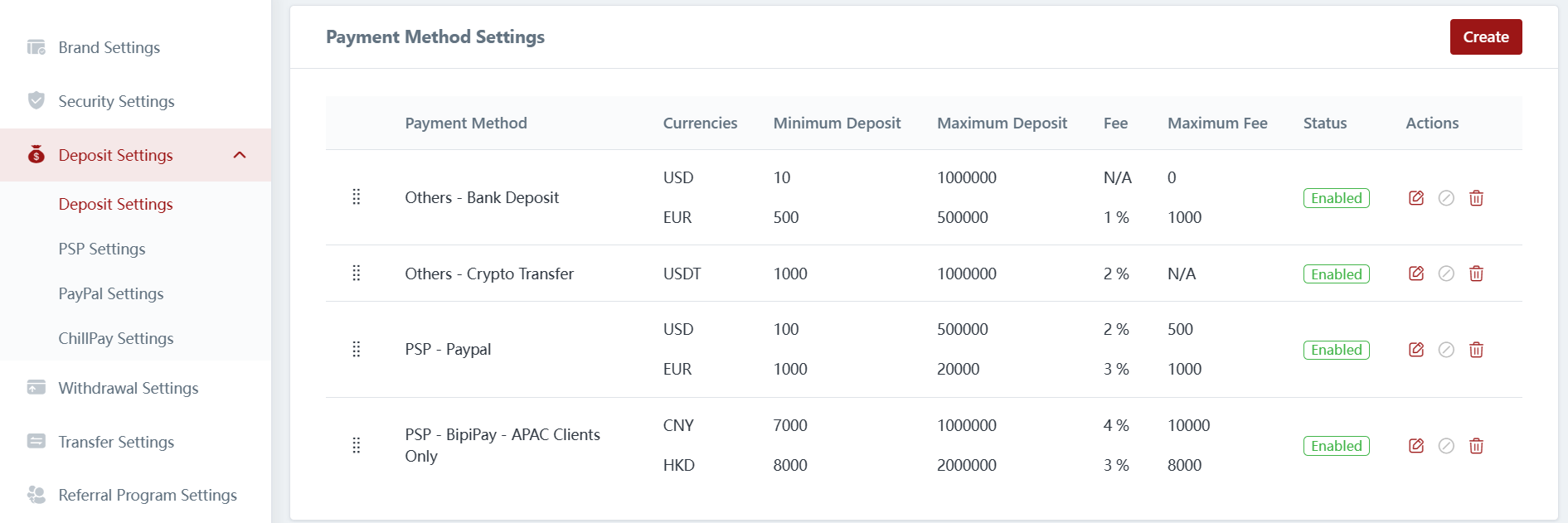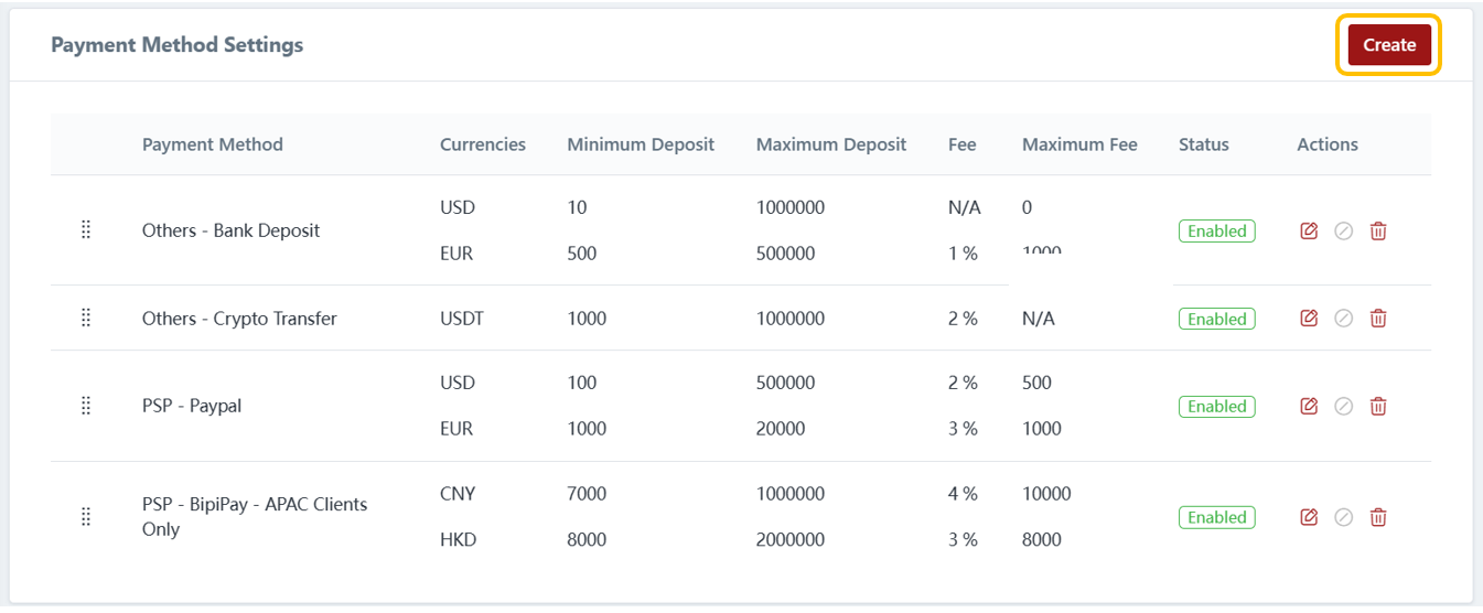 In the payment method settings, brokers can manage the available deposit methods for their clients. This includes the ability to create new payment methods, edit existing ones, disable specific methods, or delete payment methods that are no longer required. This flexibility allows brokers to customize the available payment options to align with their business requirements and provide a seamless deposit experience for their clients.
