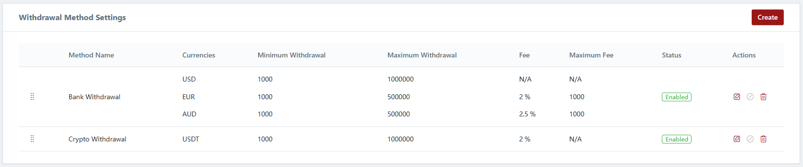 In the withdrawal method settings, you can create and configure withdrawal methods for your clients. These settings allow you to specify the currencies accepted, withdrawal fees, minimum and maximum withdrawal amounts, and customize the withdrawal form according to your requirements.