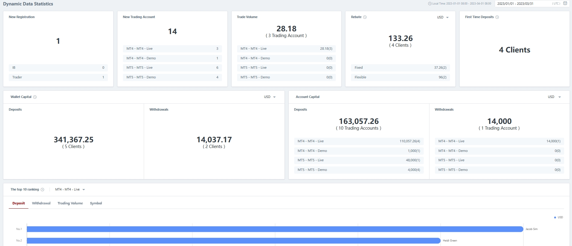 The CRM Dashboard is a valuable tool for brokers, offering a comprehensive view of clients, Introducing Brokers (IBs), and overall business operations. It consists of two distinct sections:
