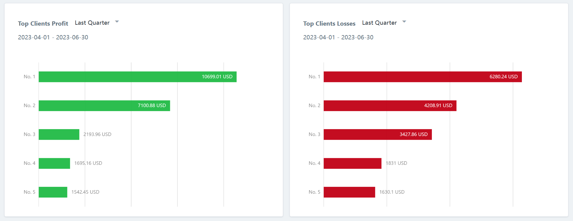 Within the risk management dashboard, you will have visibility of the top 5 most profitable traders on the left side and the top 5 least profitable traders on the right side. All profit amounts will be denominated in USD, even if the clients have different account base currencies. The system will automatically convert the profits to USD.