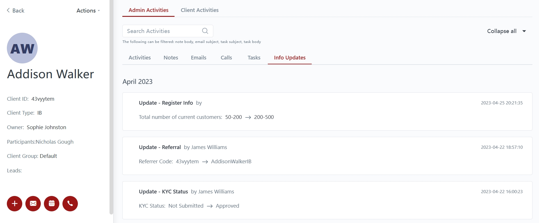 Info Updates - shows a log of each activity done for the client and the user responsible for the action.