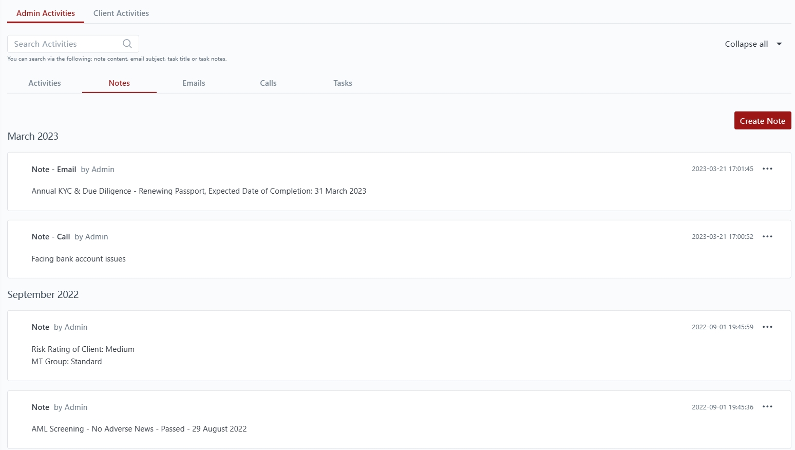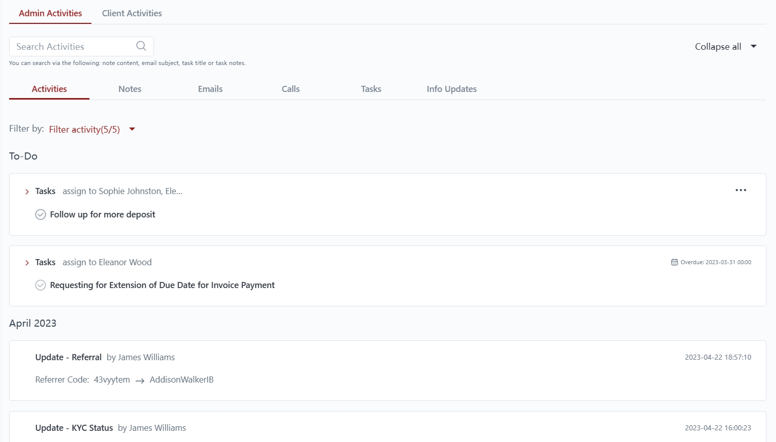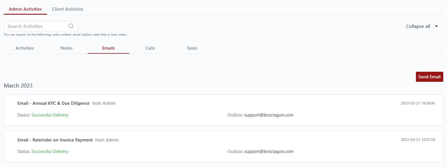 This displays all admin activities done in relation to a particular client.