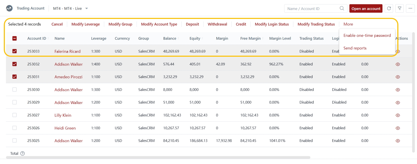 Brokers have the ability to perform bulk operations on trading accounts to increase efficiency. This means that they can perform the same action on multiple trading accounts simultaneously.