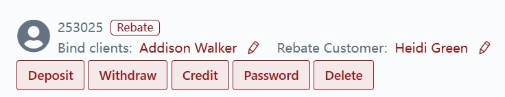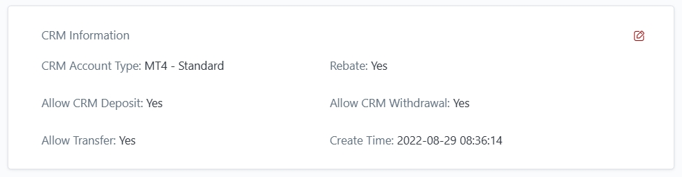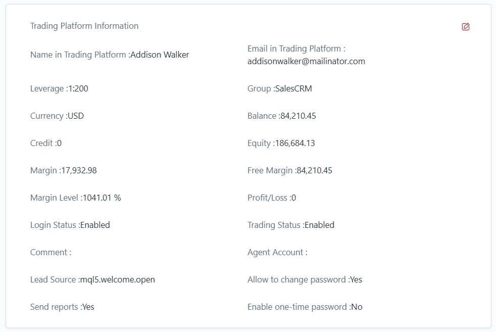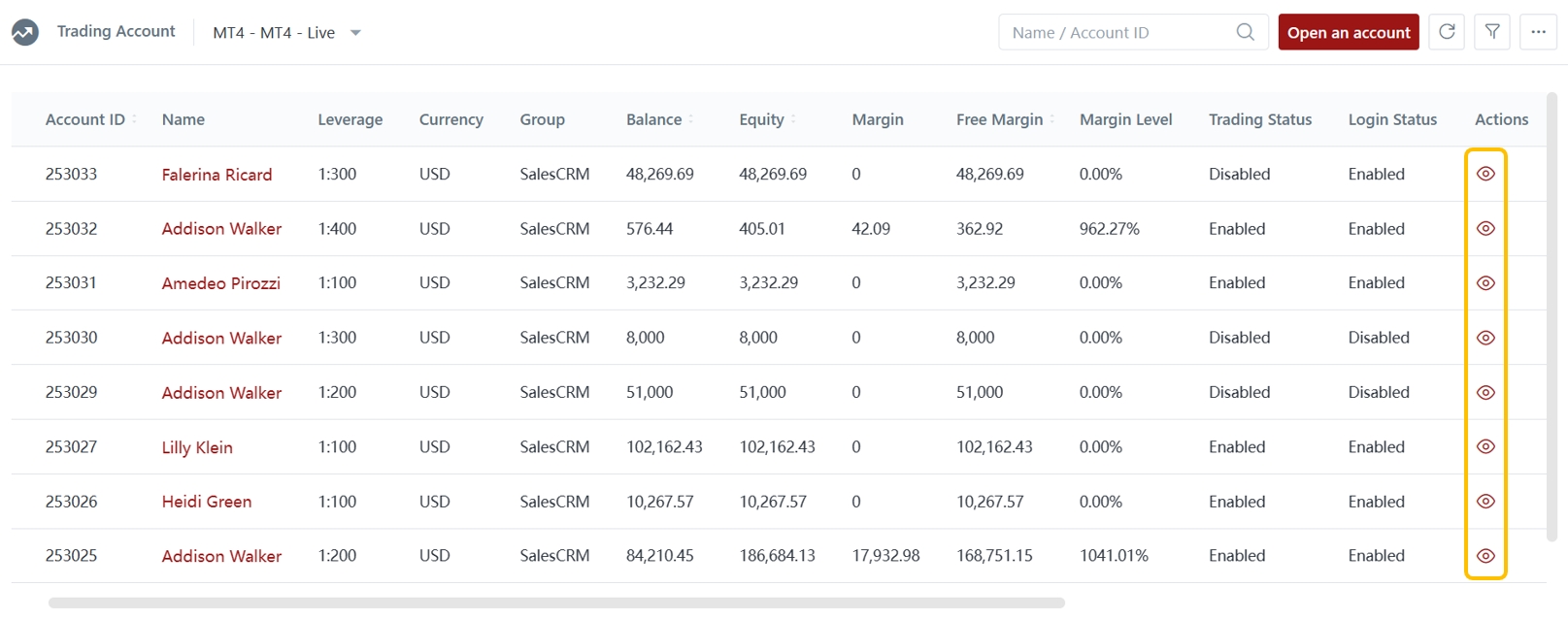 Brokers will be able to view and edit the details of the trading accounts by selecting the respective client and clicking the "View" icon.