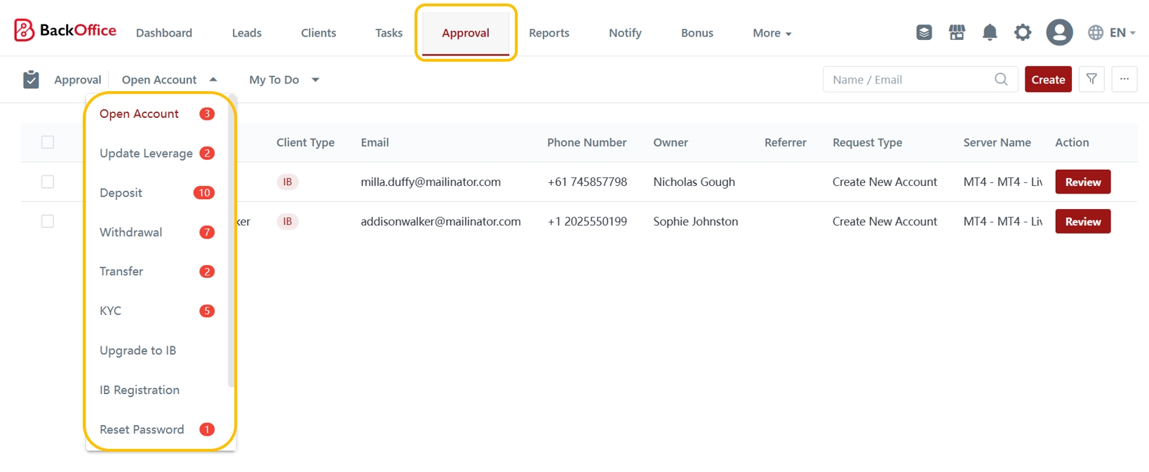 The "Approval" tab provides brokers with a centralized location to manage, review, approve or reject client requests.