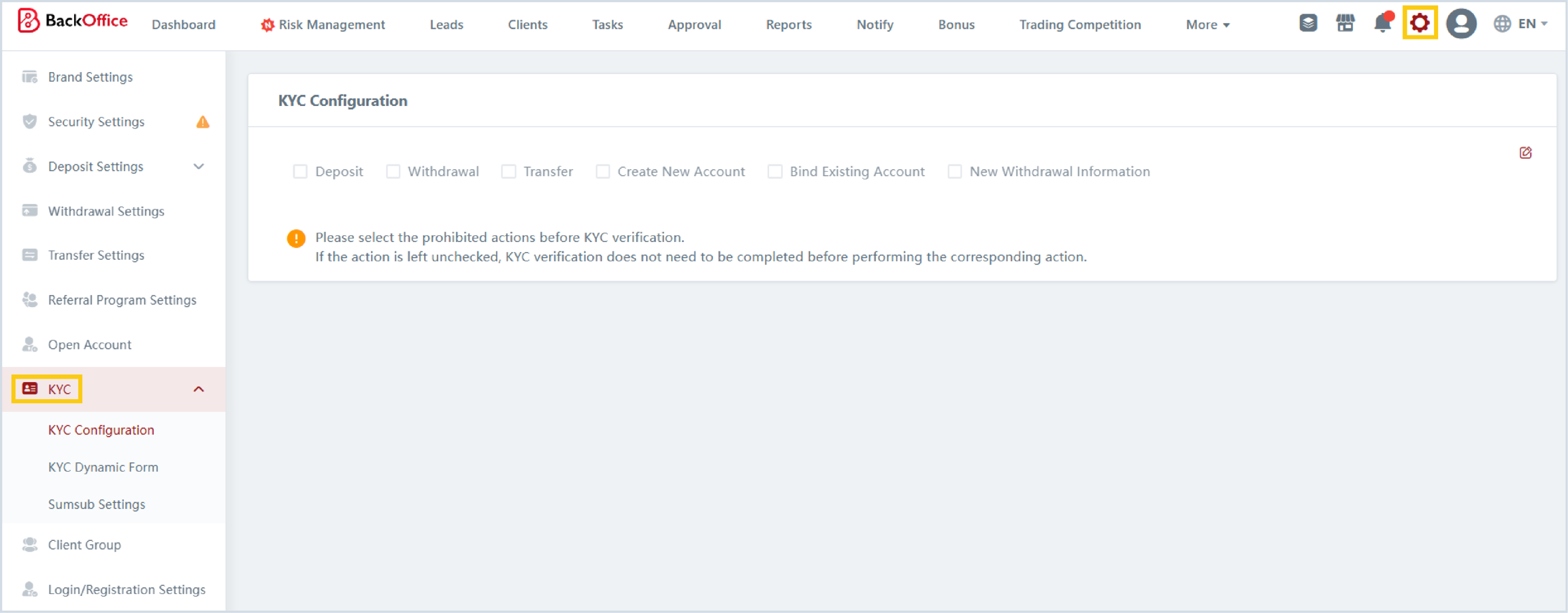 In the KYC configuration settings page, you can define the prohibited actions for clients who have not completed their KYC. This means that clients without completed KYC will be restricted from performing certain actions.