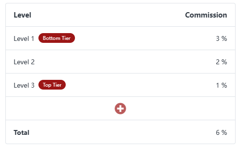 <table><thead><tr><th width="205">Referral Tree</th><th width="143">Volume </th><th width="148">Commissions</th><th>Remarks</th></tr></thead><tbody><tr><td>Hilda (Top Tier)</td><td>0 lots</td><td>1 lot x $1 = $1</td><td></td></tr><tr><td>Kamryn</td><td>0 lots</td><td>1 lot x $2 = $2</td><td></td></tr><tr><td>Shayne</td><td>0 lots</td><td>1 lot x $3 = $3</td><td></td></tr><tr><td>Eva </td><td>0 lots</td><td>1 lot x $4 = $4</td><td></td></tr><tr><td>Endah (Bottom Tier)</td><td>1 lot</td><td>$0</td><td>No commissions paid out to Endah as no commissions are set. </td></tr></tbody></table>
