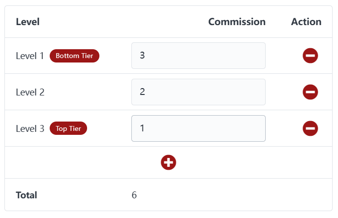<table><thead><tr><th width="205">Referral Tree</th><th width="111">Volume </th><th width="205">Commissions</th></tr></thead><tbody><tr><td>Hilda (Top Tier)</td><td>0 lots</td><td>4 lots x 5 pips x 0.0001 x 100,000 = $200</td></tr><tr><td>Kamryn</td><td>0 lots</td><td>4 lots x 2 pips x 0.0001 x 100,000 = $80</td></tr><tr><td>Shayne</td><td>0 lots</td><td>4 lots x 3 pips x 0.0001 x 100,000 = $120</td></tr><tr><td>Eva </td><td>0 lots</td><td>4 lots x 4 pips x 0.0001 x 100,000 = $160</td></tr><tr><td>Endah (Bottom Tier)</td><td>4 lots</td><td>4 lots x 5 pips x 0.0001 x 100,000 = $200</td></tr></tbody></table>